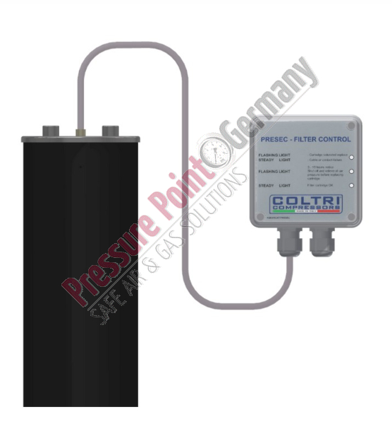Das System von Presec ist über eine Sonde mit der ersten Filterpatrone verbunden und erkennt deren Sättigungszustand, indem es entsprechend dem Status relevante Schaltsignale an die Anzeige überträgt. Wenn die Filterpatrone erschöpft ist, schaltet sich der Kompressor ab und kann erst wieder gestartet werden, wenn die Patrone ausgetauscht wurde.